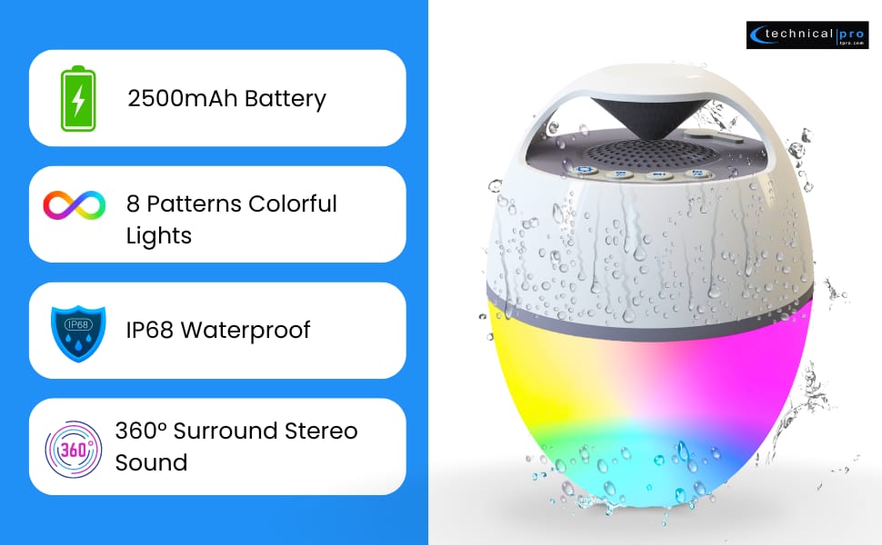 Es handelt sich um einen wasserdichten (IP68-zertifizierten), schwimmenden Bluetooth-Lautsprecher für Pools mit Flammen-Blinklichteffekt und warmgelbem Licht.