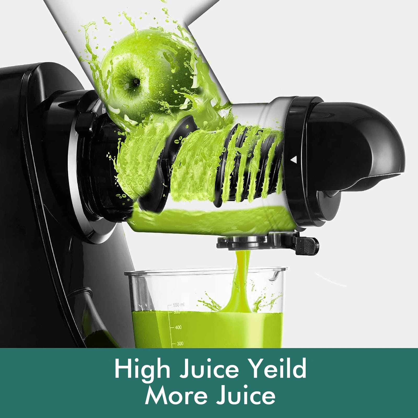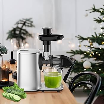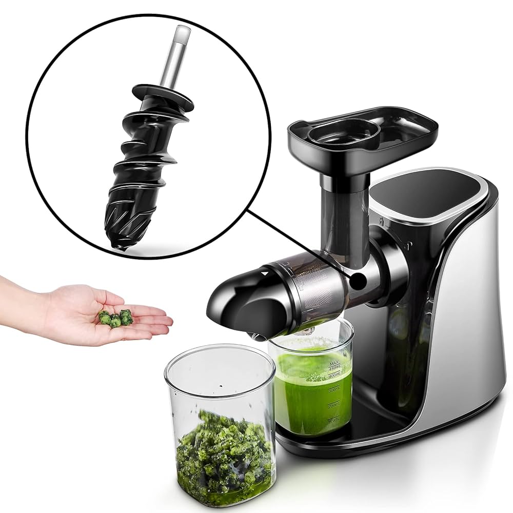 Ein VPCOK Slow Masticating Juicer, Modell: JS3004. Dieser Entsaftertyp extrahiert Saft durch langsames Pressen und Zerkleinern von Obst und Gemüse. Dadurch bleiben vermutlich mehr Nährstoffe und Enzyme erhalten als bei Hochgeschwindigkeits-Zentrifugalentsaftern.